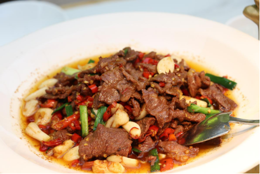 滿滿的一大盤牛肉,薄厚均勻,瘦而不柴,鮮嫩多汁。搭配精致的黃銅牛擺盤加熱,軟嫩細滑的肉質裹挾著熱辣的香氣迅速侵占你的味蕾,口腔不自覺地分泌起唾液,這是面對美食的不由自主,只能深陷其中。