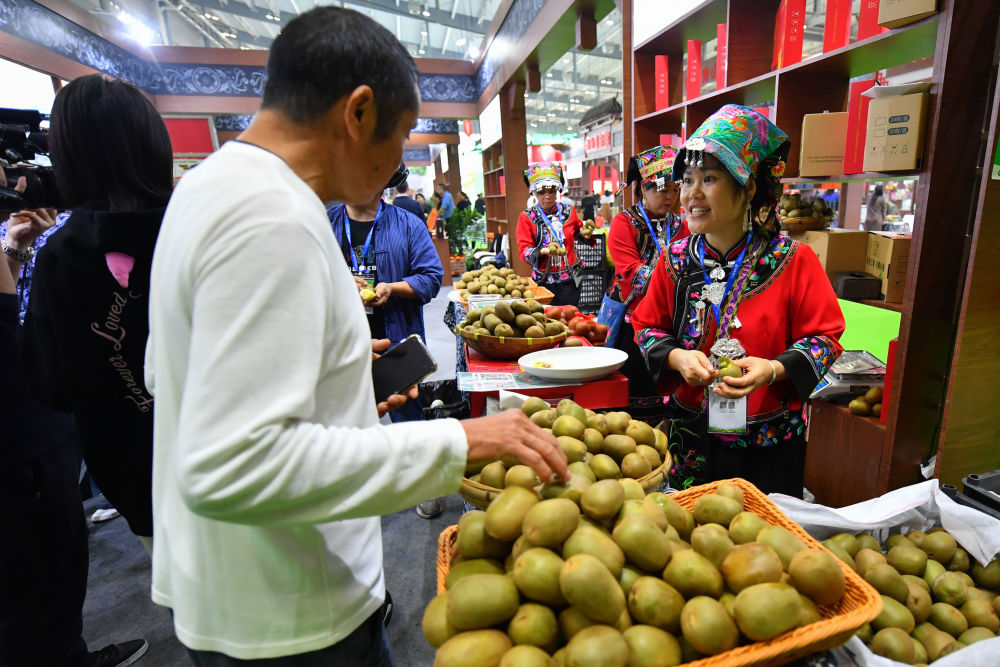 在農(nóng)博會現(xiàn)場,湘西蔬果展區(qū)的參展商向參觀者介紹獼猴桃。 新華社記者 陳澤國 攝